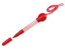 Blauschreibender Kunststoffkugelschreibermit Metallclip, Seifenblasenset und Halsband aus Textil.