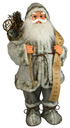 Grösse: 60cm, grau Bekleidung, graue Jacke mit pelzähnlichen Verzierungen, Mütze mit Glocke, pelzähnliche Schuhe, wuscheliger Bart, befüllter Sack auf dem Rücken, Brille auf d ...