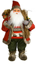 Grösse: 60cm, rotgraue Bekleidung, Mantel und Hose mit pelzähnlicher Verzierung an den Rändern, Mütze, Skischuhe in der Hand, wuscheliger Bart, Rucksack auf dem mit Geschenken b ...