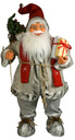 Grösse: 60cm, grau-rote Bekleidung, graue Jacke Hose mit pelzähnlicher Verzierung, Mütze mit Glocke, wuscheliger Bart, Geschenk in der Hand, Sack und Baum auf dem Rücken befüll ...