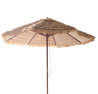 Garten- und Sonnenschirm "Hawaii" : Durchmesser von ca. 268 cm spendet viel Schatten, mit 2-teiligem Holzstock (Durchmesser 3,8 cm) und Holzgestaenge, mit Seilzugsystem zum Oeffnen, wetterfeste Polyesterstreifen-Bespannung in Stroh-Optik, ohne Standfuss, braun, ca. Ø268 cm