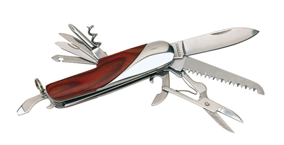 Taschenmesser : mit Schere, Nagelfeile, Flaschenoeffner, Korkenzieher, Schraubendreher, Dosenoeffner, Ahle, Spleisser, Entschupper, Saege und Schluesselring, im Holzetui, braun, silber, 9,4 x 2,4 x 2,1 cm