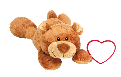 Pluesch-Teddy "Nick" : liegend, mit weichem Fell und Herz zum Bedrucken, braun, rot, weiss, ca. 23 cm