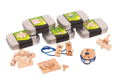 Geschicklichkeitsspiel "Think about" : in Metalldose mit Papierbanderole, 5-fach sortiert, silber, 9,6 x 6 x 2,1 cm