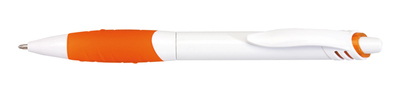Kugelschreiber "Jingle" : mit Druckmechanismus, gummierter Griffzone, geschwungenem Clip, blauschreibend, orange, weiss, 14 cm