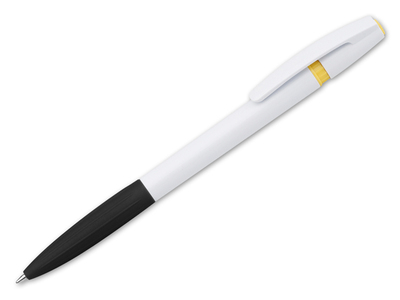 Kunststoffkugelschreiber mit Gummigrip, blauschreibender Mine und Gel-Textmarker.