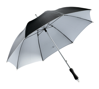 Aluminium-Fiberglas-Stockschirm "Joker" : 290g-leichtes Gestell, Aluminiumstock, Fiberglasspeichen, Metalltips, Moosgummigriff mit Metallring, Polyester-Pongee-Bespannung mit silberfarbiger Paspelierung und Druckknopfverschluss, schwarz, silber, Ø106 cm
