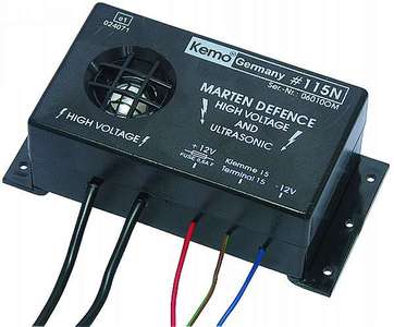 Marderstopp ''Twin- Protect''Produktbeschreibung: Doppelte Sicherheit durch Ultraschall und Hochspannung!- 6 Hochspannungsplättchen (400- 700V)- erzeugen ungefährliche Nadelimpulse (Weidezaun- Prinzip)- Spezial- Kallottenlautsprecher für hohen Abstrahlwinkel- Schalldruck 100dB - LED- Betriebsanzeige- Maße Modul LxBxH: 145x73x46mm- Betriebsspannung: 12V= - Stromaufnahme <5mAMaße in mm (BreitexLängexHöhe): xxGewicht in Kg: