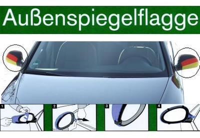 Das Außenspiegelflagge- Set Deutschland *Das Original* ist ein elastisches Textilprodukt um die Auto-Außenspiegel zu individualisieren. Die Innenseite des Außenspiegels bleibt frei, so dass das Sichtfeld uneingeschränkt ist. Die Flaggen können beliebig oft angebracht und rückstandslos wieder entfernt werden. Sie sind dank integrierter Nanostrukturen schmutzabweisend und bei 30 } bis zu 30 - mal ohne Farb - und Qualitätsverlust waschbar. Die Autoflaggen passen sich dank ihrer elastischen Strukturin 92% aller gängigen Spiegelformen z. B. Fiat 500, VW Golf, Opel Signum, BMW 7er, Audi A6 an. Für Sondergröße von extra großen SUV - u. Kleintransporterspiegel, z. B. BMW X5, VW T5, Mercedes Vito Audi Q7 ist diese Flaggengröße nicht geeignetfaltenfrei an:Maße, ca.: 220 x 160 x 20 mmMaterial: 82 % Polyethylen, 18 % Elasthan-Einfach über die Spiegel ziehen und los-Passt auf alle gängigen PKW Spiegel-Perfekter, faltenfreier Sitz bis 250 km/h-Straßenzulassung durch die DEKRABitte beachten Sie folgende Hinweise für die Nutzung der gemäß DEKRA Gutachten:1. Das uneingeschränkte Sichtfeld der Spiegelfläche.2. Die Gewährleistung der Spiegelverstellmöglichkeit.3. Das Freibleiben der Fahrtrichtungsanzeiger.4. Einen Außenspiegel mit verjüngtem Haltearm.Der Lieferumfang umfasst 2 Stück, für jede Seite einen.