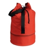 Black backpack with colourful accents in 600D polyester and drawstring cord on the front panel. Mesh pockets on both sides.