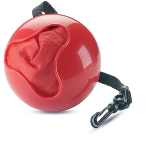 ABS plastic ball with a karabiner strap, including an opening that holds a 190T polyester shopping bag . The plastic ball can be detached from the bag thanks to a snap button.
