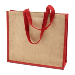 Jute shopping bag with coloured detail. Strong plasticized coated jute with colour matching cotton handles.