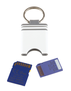 Schluesselanhaenger "Memory" : traegt und haelt SD-Speicherkarte oder Memory-Stick am Schluesselbund, weiss, grau, 8 x 3,7 x 0,7 cm