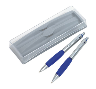 Schreibset "Penfan" : bestehend aus Druckkugelschreiber (schwarzschreibend) mit Grossraummine und Bleistift, gummierte Griffzone, im Etui mit transparentem Deckel, blau, 16,7 x 5,5 x 2,3 cm