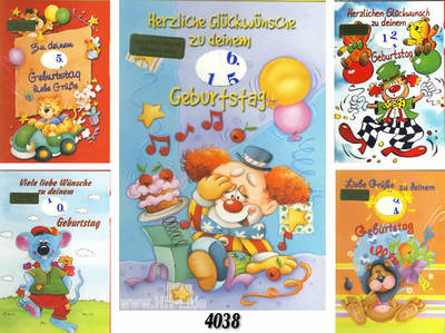 Geburtstags-Karte mit Drehzahlen, lustige Motive, einzeln mit farbigem Kuvert in Cellophan verpackt