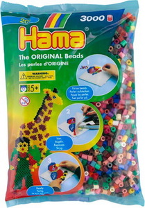 Beutel mit 3000 HAMA-Perlen im Vollton-Mix: 22 Farben (Weiß, Creme, Gelb, Rot,Orange, Hellrot, Lila, Blau, Hellblau, Grün, Hellgrün, Braun,Grau, Schwarz, Rotbraun, Hellbraun,Hautfarbe, Beige, Olivgrün, Violettrot, Maulbeer, Türkis).Ab 5 Jahren.