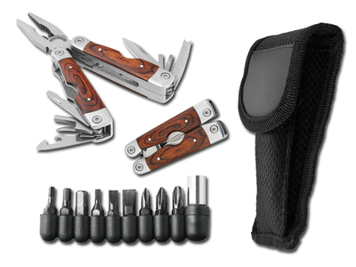 Multifunktionswerkzeug mit 19 Funktionen in Nylonhuelle. Material: Edelstahl und Holz.