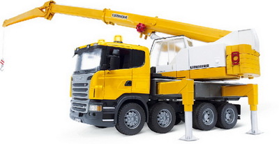 Bruder Scania R-Serie Liebherr Kran-LKW, L+SWahrsten Sinne des Wortes ragt der imposante Liebherr-Kran-LKW aus der BRUDER Range der Nutzfahrzeuge.Der LKW-Kran hat bei ausgefahrener Teleskoplänge bereits eine beachtliche Größe und kann durch einen Zusatzauflieger nochmals auf eine Kranarmhöhe von 1,30m verlängert werden.Erreicht wird eine hohe Standfestigkeit gegen Kippen durch die schwenkbaren und individuell einstellbaren Stützfüße der Fahrzeugplattform.Für noch mehr Stabilität lässt sich das angebaute Ausgleichsgewicht wie beim Originalkran verwenden.Eine neu entwickelte Seilwinde mit Feststelleinrichtung und Überlastsicherung ermöglicht ein spielend leichtes Handling des Kranhakens beim Heben und Senken, auch von großen Teilen.Wie beim Original besitzt der LKW den Scheibenschutzrahmen und eine zu öffnende Schiebetür.Ein in die Plattform integriertes Werkzeugfach rundet die vielen Funktionen des Krans ab.Maße: ca. L 62 x B 18,5 x H 27 cm.Inkl. Licht- und Sound-Modul.Batterien enthalten.Ab 4 Jahren.