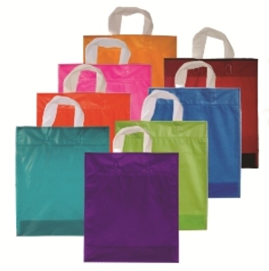 Stabile Schlaufentragetasche aus 60 my (0,06 mm) Niederdruckfolie (HD-PE) mit transparenten Trageschlaufen in verschiedenen Farben volfflächig bedruckt. Die Tragetaschen sind leicht transparent (nicht blickdicht)