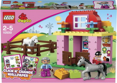 LEGO duplo 10500 Pferdestall, 1 StückÖffne die Tür des bunten Pferdestalls und bereite die Pferde für das Turnier vor!Während die Großmutter einen LEGO DUPLO Heuballen-Stein nach dem anderen an das Pferd verfüttert, kümmert sich das Mädchen liebevoll um das Fohlen.Schwing die Heugabel und dekoriere den Pferdestall mit den abnehmbaren Tapeten.Vergiss nicht, den Zaun aufzubauen, damit die Tiere sicher und geborgen sind.Im DUPLO Pferdestall gibt es viel zu tun!Ab 2 Jahren.