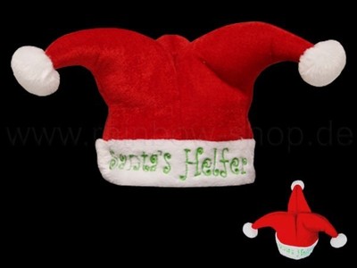 Produktname:Weihnachtsmütze "Santas Helfer" Harlekin 3 Bommel