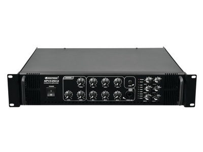 6-Zonen-ELA-Mono-MischverstärkerKomfortable Ansteuerung für ELA-Lautsprecher über 6-Zonen-Technik6 ELA-Zonenausgänge (100 V) jeweils mit 5-stufigem LautstärkestellerMaster-ELA-Lautsprecherausgang (70 und 100 V)Anschlussmöglichkeit für niederohmige Lautsprecher (4-16 Ohm)2 rückseitige Mikrofon-Eingänge (6,3-mm-Klinke, unsym.)1 frontseitiger Mikrofon-Eingang (Kombination XLR/6,3-mm-Klinke, unsym.) auf der Frontplatte mit regelbarer PrioritätsfunktionAlle Mikrofon-Eingänge mit getrennten Lautstärkereglern3 Line-Eingänge (Stereo-Cinch) mit getrennten Lautstärkereglern1 Line-Ausgang (Stereo-Cinch)Gong, schaltbarHöhen- und Bass-Klangregler für Ausgangssignal7-fache LED-PegelanzeigeLüftergekühltSchutzschaltungen mit LED-Anzeige: Überspannung, Kurzschluss, EinschaltverzögerungRackeinbauSpannungsversorgung: 230 V AC, 50 Hz ~Gesamtanschlusswert: 500 WAusgangsleistung: 250 W RMSAusgangsart: 70 V, 100 V oder 4-16 OhmAusgangsstrom: 3,6 A (70 V), 2,5 A (100 V)Mikrofoneingänge: 3,6 mV, 600 OhmLine-Eingänge: 300 mV, 10 kOhmLautsprecherausgänge: Schraubklemme, KlemmleisteFrequenzgang: 80 Hz - 16 kHzVerzerrung: 0,5 % (1 kHz)Geräuschspannungsabstand: 85 dB (Line), 75 dB (Mic)Maße: 483 x 385 x 92 mmGewicht: 12 kg