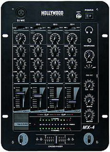 Mischpult HOLLYWOOD ''MX- 4'' 4- Kanal, schwarzProduktbeschreibung: Professionelle, unverwüstliche PA- Technik zum absoluten LowBudget Preis! Jeder Kanal einzeln regelbar (Gain, Hochton, Mittelton, Tiefton (je +12dB/ - 26dB), Lautstärke). Features: - obenliegende Anschlüsse für Mikrofon + Kopfhörer - BNC Anschluss für Lampe - Talkover- Funktion Crossfader - Cue- Funktion - LED- Beatmeter - 2 Mikrofoneingänge - Frequenzbereich 20Hz- 20kHz - Maße: 360x254x95mm - Gewicht 3,6kgMaße in mm (BreitexLängexHöhe): 330x210x330Gewicht in Kg: 5