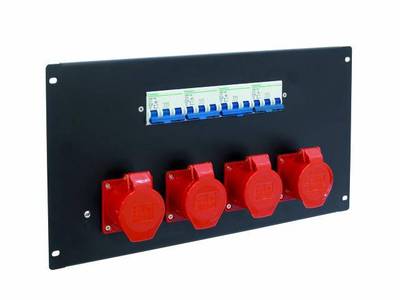 Stromverteilermodul für Rackeinbau4 CEE-Steckdosen (16 A, 5-polig)4 Sicherungsautomaten (16 A, 3-polig)Schwarze StahlfrontplatteAbmessungen (L x H) 483 x 264 mm (19'', 6 HE)