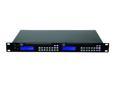 Doppel-CD- und MP3-Player mit USB-Schnittstellen1 HE flacher Doppel-CD- und MP3-Player mit Pitchregelung zur Festinstallation z. B. in Restaurants, Geschäften und FitnessstudiosUSB-2.0-Schnittstellen zum Anschluss von USB-Speichergeräten40 Sekunden Anti-Shock-PufferPitchregelung ±16 %Slot-in-LaufwerkeAudio-CD/CD-R/CD-RW/MP3-CDBlau hinterleuchtete LCD-AnzeigeCue-FunktionLoop-/Reloop-FunktionEinzel- oder GesamttitelwiedergabeZufallswiedergabeWiederholfunktionen: Repeat 1, Repeat AllTitelprogrammierungBequeme Titelwahl mit Skip-Tasten und +10-TasteOrdnernavigationInkl. Montagewinkeln für 482-mm-Rackeinbau (1 HE)Spannungsversorgung: 100 - 240 V AC, 50/60 Hz ~Gesamtanschlusswert: 10 WGeeignete CDs: CD/-R/-RW im CD-DA- und MP3-Format (12 cm)Geeignete Speichermedien: USB-Geräte bis max. 32 GBWiedergabeformat: MP3Geschwindigkeitsanpassung: ±16 %Programmspeicher: 20 TitelDisplay: Titelrestspielzeit, Titelabspielzeit, Gesamtrestspielzeit (Audio-CD) Dateiname, Ordnername, Titelrestspielzeit, Titelabspielzeit (MP3-Datei)Klirrfaktor: 0,1 %Geräuschspannungsabstand: 60 dBFrequenzgang: 20 - 20.000 HzAudioausgänge: 2 x Stereo-CinchMaße (LxBxH): 482 x 270 x 44 mmRackeinbau, 1 HEGewicht: 3 kg