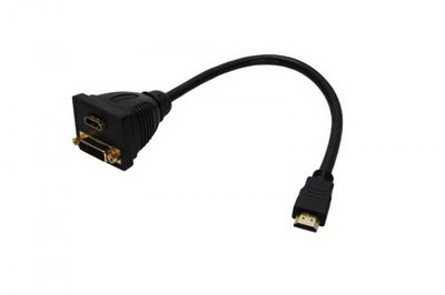 Adapter HDMI 19p (Bu.) + DVI-D 24+1 (Bu.) - HDMI 19p (St.) goldTechn. DatenHDMI (High Definition Multimedia Interface)19pol. HDMI Stecker auf 19pol. HDMI Buchse + DVI-D 24+1 BuchseStecker 1: HDMI MaleStecker 2: HDMI Female / DVI-D 24+1 Femalevergoldet: jaAußenmaterial: KunststoffKabellänge: 0,3mFarbe: blackAbmessungen: 61,3 x 44,9 x 37,6 mmVerpackung: wenn keine Verpackung auf dem Bild angezeigt ist, dann ist der Artikel bulk-verpackt (Druckverschlussbeutel)