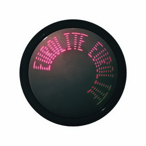 Runde LED LaufschriftLED-Laufschrift zur Anzeige des gewünschten TextesIdeal für Werbung im Laden oder WerbegeschenkeInterne Programme oder zum selbst kreierenKomfortable Eingabe über ControllertastenSonderzeichen auch möglichVorteile der LED-Technologie: lange Lebensdauer, niedriger Gesamtanschlusswert, minimale Wärmeentwicklung, quasi wartungsfrei bei brillantem AbstrahlverhaltenProgrammierung über mitgelieferte FernbedienungSpannungsversorgung 230 V über beiliegendes Netzteil oder über 4 x AAA 1,5-V-Batterien (optional)Spannungsversorgung: 6V DC, 500mA (über beiliegendes Netzteil) oder 4 x 1.5 V AAA BatterienGesamtanschlusswert: 5 WDisplay-Farbe: rotKapazität: 160 ZeichenWiedergabegeschwindigkeit: 8 EinstellungenMaße (Durchmesser x Höhe): 150 x 40 mmGewicht: 0,5 kgAnzahl der LEDs: 16