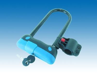 Bügel-SicherheitsschlossStahlbügelschloss mit Universalrahmenhalterung aus schwarzem Kunststoff mit zwei Sicherheitsschlüsseln und Schutzkappe für Schließzylinder.Farbe: schwarz-blauMaterial: StahlMaße: ca. 230 x 130 x 40 mmVerpackung: Karte