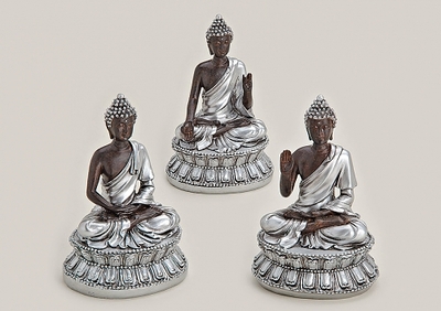 BUDDHA SITZEND POLY SILBER 3-F.SORT.14X9X8CM - Mindestauftragswert 300 € innerhalb Deutschland / Frachtfrei ab 1.200 € innerhalb Deutschland / Zahlungskonditionen laut AGB, Vorkasse oder Nachnahme für Neukunden