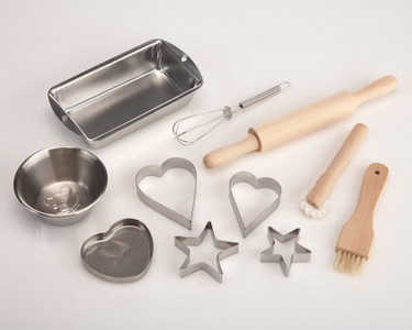 Set bestehend aus Backform rechteckig, Backform Herz, Muffin-Form, 2 Ausstechformen Herz, 2 Ausstechformen Stern, Pinsel, Schneebesen, Teigrolle und Teigrädchen.Ab 3 Jahren.