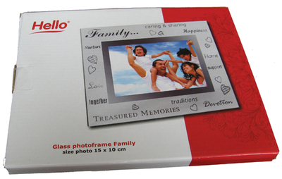 im Buntkarton verpackt, Fotogrösse: 15x10cm, Glasbilderrahmen mit Aufdruck , mit (verschiedene Wörter im Zusammenhang mit Familie bedruckt (family - home - happiness - love), Grösse des Rahmens: 22,4 x 17,4cm, zum Aufstellen