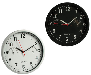 Kunststoff-Wanduhr mit Hygrometer & Thermometer Durchmesser: ca. 23 cm, 2-farbig sortiert (silber und schwarz), für 1 Mignon Batterie AA (nicht im Lieferumfang enthalten)