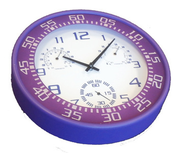 Durchmesser: 25cm, modernes Design, mit Thermometer und Hygrometer, 4 Farben gemischt im Karton (lila. rot, blau, grün)Batteriebedarf: 1 x AG13 - im Lieferumfang enthalten1 x R6 - nicht im Lieferumfang enthalten