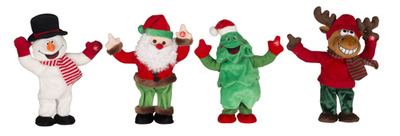 singende und tanzende Plüschfigur, mit erhobenen Händen, vier verschiedene Modelle gemischt im Karotn (Schneemann, Weihnachtsmann, Tannenbaum, Elch), sehr lustig, Batterien im Lieferumfang enthalten (Bedarf: 3xR6), ca. 33cm, Breite und Tiefe variiert je nach Modell,
