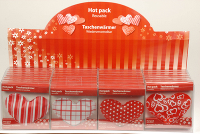 wiederverwendbar, im Aufsteller, jedes einzeln klarsicht verpackt, Grösse der Verpackung: 10,5 x 11,2 x 1,1cm, Grösse Herz: 10 x 9cm, durch biegen der Metallscheibe aktivieren, Wärme für 30 Minuten, um es wieder zu verwenden 5-10 Minuten in kochendes Wasser legen,