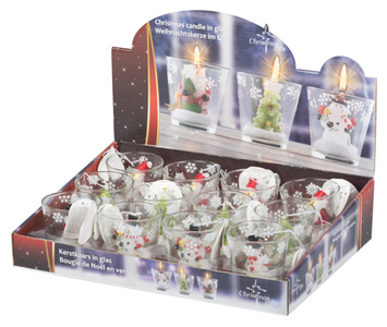 weihnachtliche Kerzen in 3 verschiedenen Designs (Kerze im Schneemann, Weihnachtsbaum- und Weihnachtsmann-Design), Durchmesser 6,3cm, Höhe Glas 6,5cm,-- Versand nur auf Paletten - da bei DHL und DPD Bruchgefahr besteht --