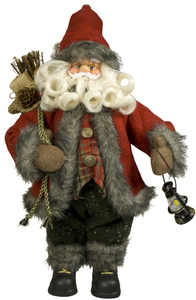 Grösse: 30cm, grau-rote Bekleidung, Jacke mit grauer pelzähnlicher Verzierung, Mütze mit Glocke, wuscheliger Bart, befüllter Sack auf der Schulter, Brille auf der Nase, Laterne Handsehr sehr schön verarbeitet
