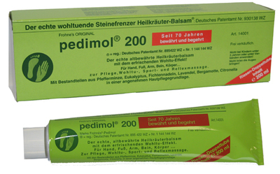 Frohnes Original Pedimol 200, seit 70 Jahren bekannt, altbewährte Heilkräutersalbe, erfrischender Wohltu-Effekt, zur Massage auf Hand - Fuss - Arm - Bein und Körper, erfrischend nach körperlicher und geistiger Anstrengung, auch als Handschutzpflege einsetzbar, mit den Bestandteilen der Minze - Eukalyptus - Fichtennadel - Lavendel - Bergamotten - Citronnellen Inhaltsstoffe:Aqua, Mentha Piperita Oil, Cellulose Gum, Eucalyptus Globulus Oil, Hectorite, Hydroxyethanol, Citrus Aurantium Bergamia Oil, Lavandula Angustifolia Oil, Citric Acid, Cymbopogon, Nardus Oil, Benzyl Alcohol, Potassium Sorbate, Tocopherol, Formic Acid, CI42051, CI19140