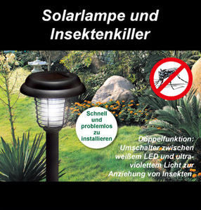 Mit Erdspieß 41 cm hochschnell und problemlos zu installieren, Insektenkiller und Solarlampe seperat schaltbar, durch Umwandlung von Sonnenlicht in Strom lädt der Sonnenkollektor die integrierte Batterie auf, bei Einbruch der Dunkelheit wir automatisch das Licht eingeschaltet (je nachdem welche Funktion aktiviert wurde), Insektenvernichtungsfunktion ist in beiden Funktionen aktiv, CE, RoHSSpezifikationen:max. Funktionsdauer: 8 Stundeninterne Batterie: AA Ni-MH 600 mAh, wiederaufladbarLichtquelle: besonders helle LEDs, ein weisses LED-Licht und 2 blaue LED-Lichter (zur Insektenvernichtung)