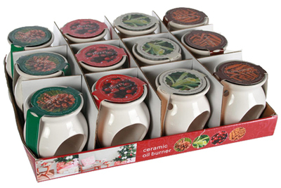 Keramik-Aromalampe mit Duftmelts (Vanille/Kiefer/ Winterbeere/Zimt) ca. 7 x 8 cm 12 Stück im Verkaufsaufsteller