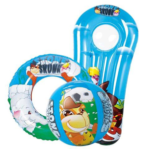 schönes buntes Kinder-Schwimm-Set, im praktischen Plastik-Tragebeutel, bestehend aus 3 Teilen Matratze - 115x60cmBall - 40cm DurchmesserSchwimmreifen - 55cm Durchmesser