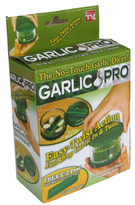 bestehend aus einer Knoblauchrolle (12,5cm lang) und einem Knoblauchschneider (6cm hoch und 8,7cm Durchmesser), im Buntkarton verpackt,geschälter Knoblauch einfach in den Schneider reinlegen und drehen und schon erhält man klein geschnittenen Knoblauch
