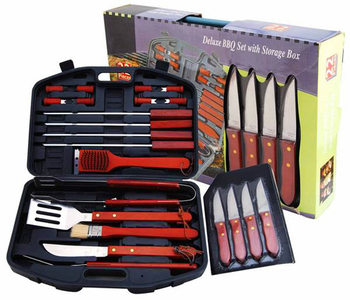 22 teiliges Barbeque-Set, im Koffer, im Buntkarton, Griffe in Holzdesign, Set bestehend aus:Reinigungsbürste, Grillzange, Pinsel, 4 Steakmesser, 4 Grillspiesse, 8 Maiskolbenhalter, 1 Messer, 1 Gabel, 1 Bratenwender