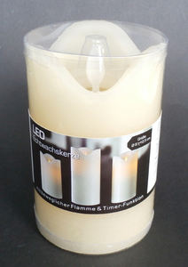 mit beweglicher Flamme, rau elfenbeinfarbener Wachs mit rauer Oberfläche, flackerndes LED-Licht, mit Batteriefach, Batterien nicht enthalten (Bedarf: 2x AA), ca. 8cm Durchmesser, mit An/Ausschalter, Sleep-Funktion, in PVC Verpackung, Höhe: 12,5cm