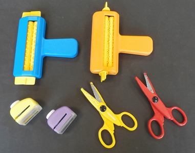 6 teiliges Bastelset zum künstlerischen Bearbeiten von Papier, Set bestehend aus2 Scheren - 2 verschiedene Schnittflächen2 Papierwalzen - Stern- und Wellenform2 Stanzgeräte - Blumen- und Schmetterlingsform