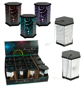 Sechseckige Metall-Laterne mit Kette & farbwechselnden LED ca. 11 x 8 cm, 4-fach sortiert, für 3 Micro Batterien (AAA), 12 Stück im Display